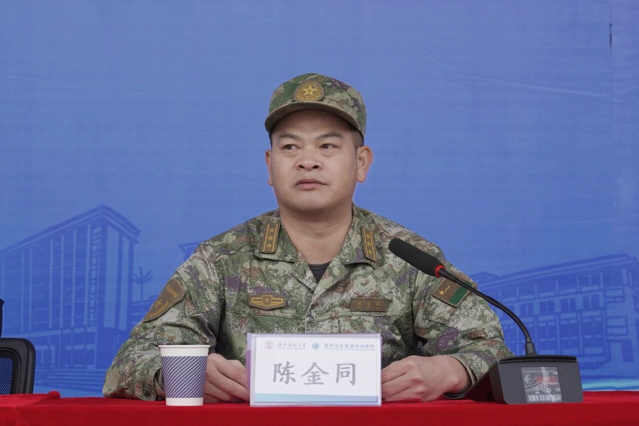陈金同结合当前国际局势,阐释了和平年代开展军训的重要意义,勉励同学们将军训中养成的纪律意识、坚韧品格和家国情怀融入日常学习生活,牢记“广大精微,信德高远”的校训,深耕专业知识、练就过硬本领,成长为有理想、敢担当、能吃苦、肯奋斗的新时代好青年,用青春之力筑牢国防之基。