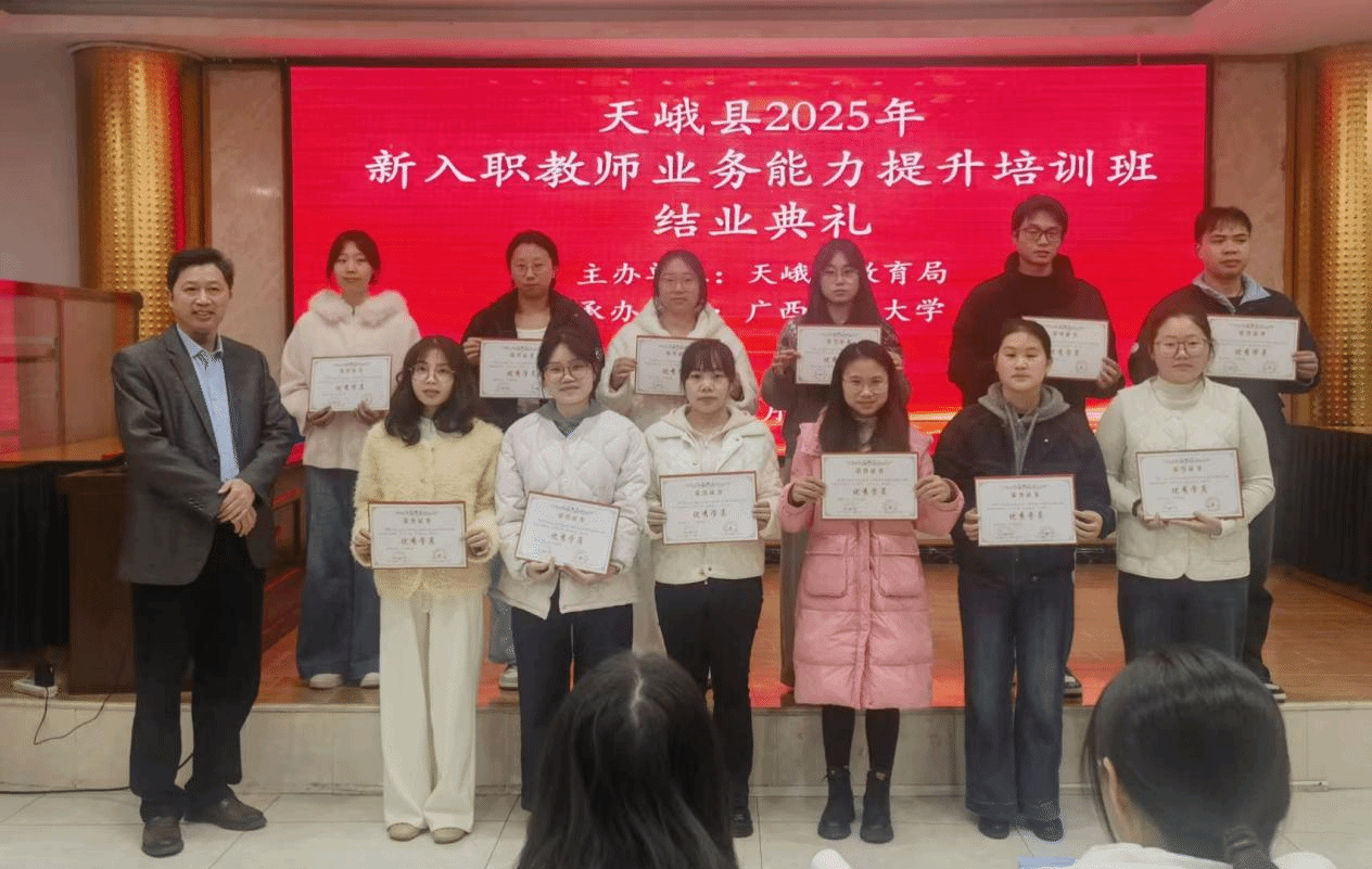 通识教育学院 王伟 报道 11月17日至19日,由天峨县教育局主办,我校承办的天峨县2025年新入职教师业务能力提升培训班在天峨县顺利举办,来自天峨县各中小学校93位新入职教师参加了此次培训。我校通识教育学院党总支书记武峰参加开班仪式致欢迎词,院长韦览恩带领新教师入职宣誓,天峨县教育党组成员王嵊参加开班仪式并作开班动员讲话。