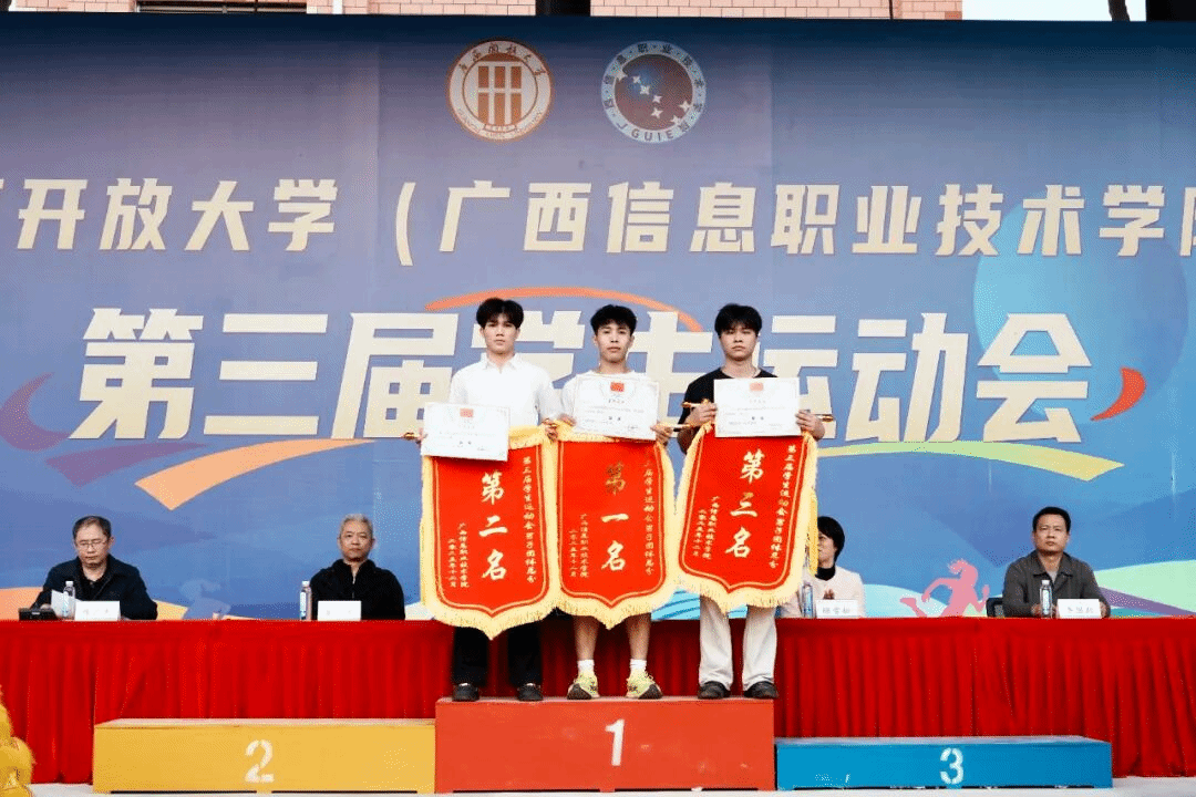 裁判长、通识教育学院教师陈采铃宣布运动会比赛成绩。本次比赛共设置100米、200米、400米、800米、1500米、跳高、跳远、铅球、4*100米接力、4*300米接力、20*50米接力、毽球、高杆抛绣球、三人板鞋竞速、羽毛球混合团体赛、乒乓球混合团体赛,共计16项比赛。经过两天的激烈比拼,按照比赛项目的设置以及男女生分组,共约620人次获奖;数字经济与管理学院、北斗与通信学院(智能制造学院)、数字艺术与传媒学院获团体总分前三名;北斗与通信学院(智能制造学院)、数字经济与管理学院获“道德风尚”奖;计算机与人工智能学院、数字艺术与传媒学院获“优秀组织奖”。