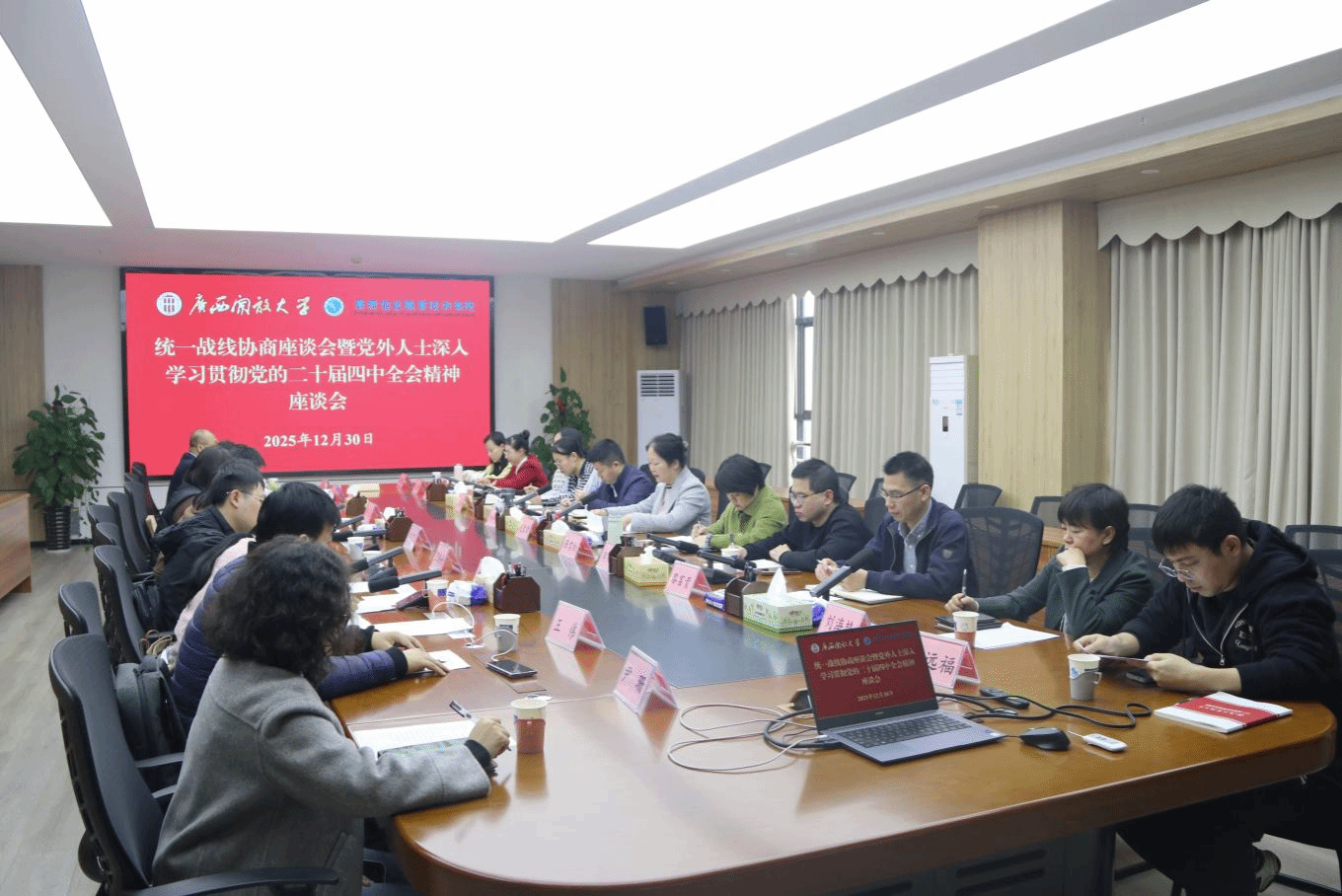 党委统战部 侯蕾 报道 2025年12月30日,我校召开统一战线协商座谈会暨党外人士深入学习贯彻党的二十届四中全会精神座谈会。学校党委副书记龙雪津通报2025年学校重点工作情况并讲话,党委委员、党委统战部部长胡峥嵘主持会议,党委组织部、党委宣传部等部门负责人,以及民主党派成员、无党派人士和党外知识分子代表参加会议。