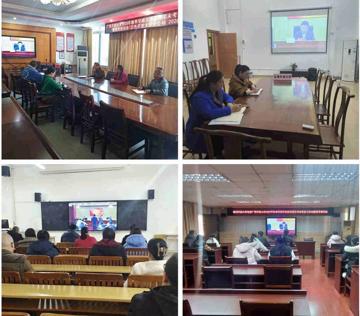 开放教育学院 余德富 报道 1月9日下午,学校以“线下线上”结合方式,召开广西开放大学2025年秋季学期开放教育期末考试考务工作会暨巡考培训会。副校长黄远鸣出席会议并作部署讲话,学校纪委办公室副主任伍立凌、巡考员、直属考点主考、产业学院及开放教育学院全体人员在主会场参加现场会议,全区各市、县开放大学,学习中心负责人及考点全体考试工作人员线上参会。开放教育学院院长江祖辉主持会议。