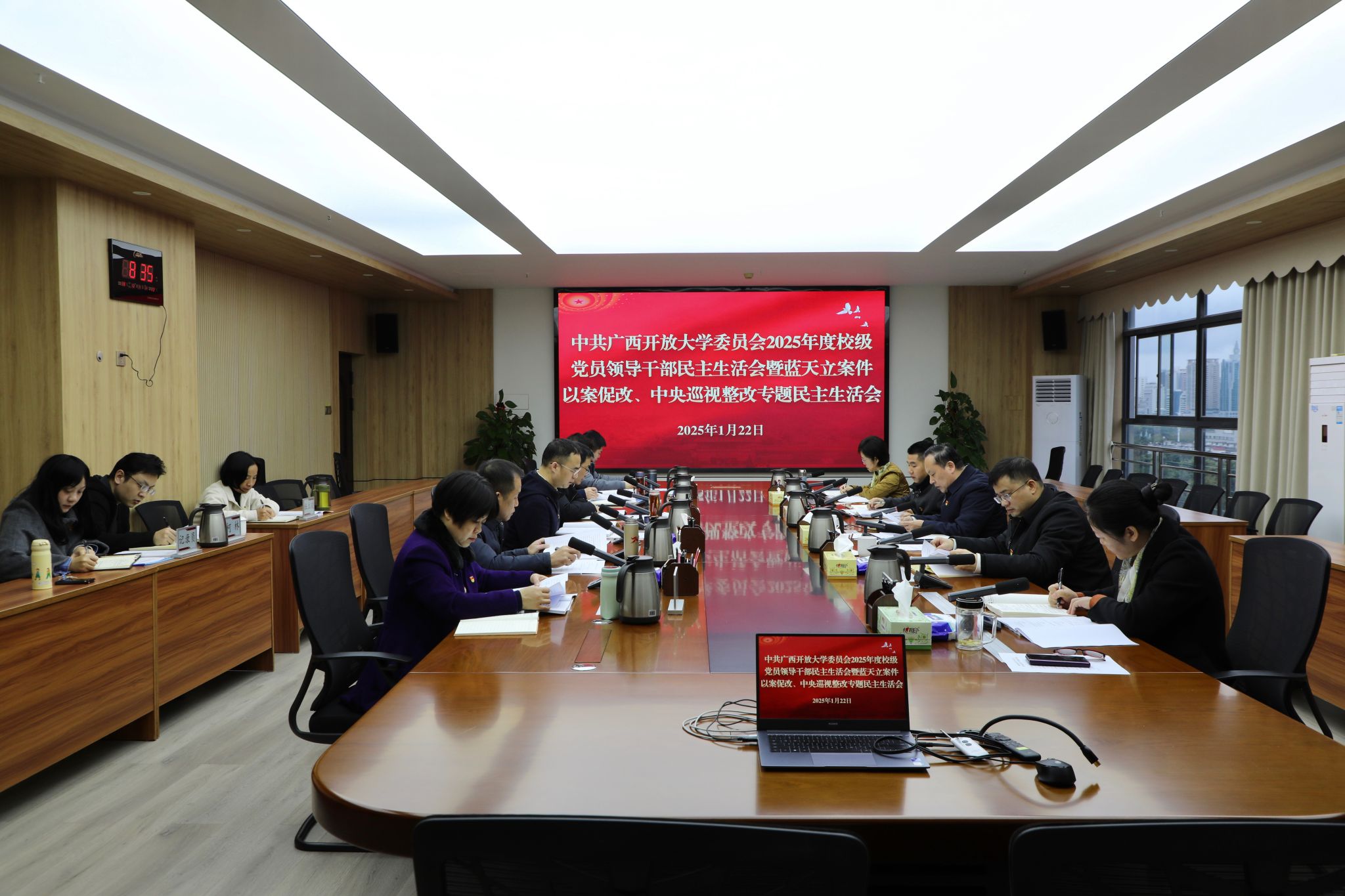 党委组织部 何艳珍 报道 按照党中央和自治区党委的部署要求,1月22日上午,学校党委领导班子在东宝校区远教大厦召开2025年度民主生活会暨蓝天立案件以案促改、中央巡视整改专题民主生活会。会议深入学习贯彻习近平新时代中国特色社会主义思想,全面贯彻落实党的二十届四中全会精神,围绕会议主题,严肃开展批评与自我批评。自治区纪委监委第九监督检查室四级调研员黄海利、自治区党委教育工委组织部四级调研员陈赐军到会指导。学校党委副书记、校长王兴辉主持会议并总结讲话。学校领导龙雪津、李敏智、刘绍英、辛立章、侯宗毅、黄远鸣参加会议。
