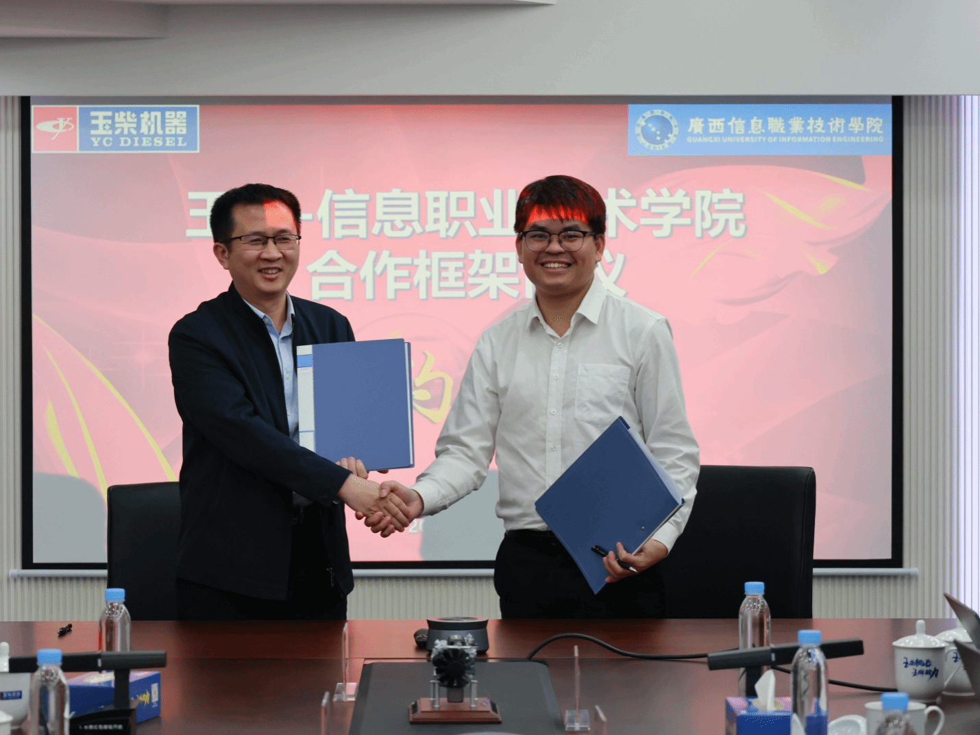 在玉柴考察期间,王兴辉一行先后参观了玉柴科技馆、全自动智能生产车间,详细了解企业发展历程、核心技术研发、生产制造流程及人才队伍建设等情况,对玉柴在高端装备制造领域的技术实力和行业影响力给予高度评价。座谈会上,王兴辉介绍了学校的办学定位、专业特色、人才培养成果及未来发展规划。他表示,玉柴作为区内制造业龙头企业,与学校的专业布局高度契合,希望以此次考察为契机,深化双方在人才培养、实习就业、产学研合作等方面的协同联动,实现校企资源互补、互利共赢。玉柴副总裁蔡小红对考察团的到访表示热烈欢迎,介绍了企业的人才需求导向和未来发展布局,并表达了与学校开展深度合作的迫切意愿。会上,广西信息职业技术学院副院长邓明学与玉柴设备动能事业部总经理温道明代表双方签订了校企合作框架协议,为后续合作的落地实施奠定了坚实基础。