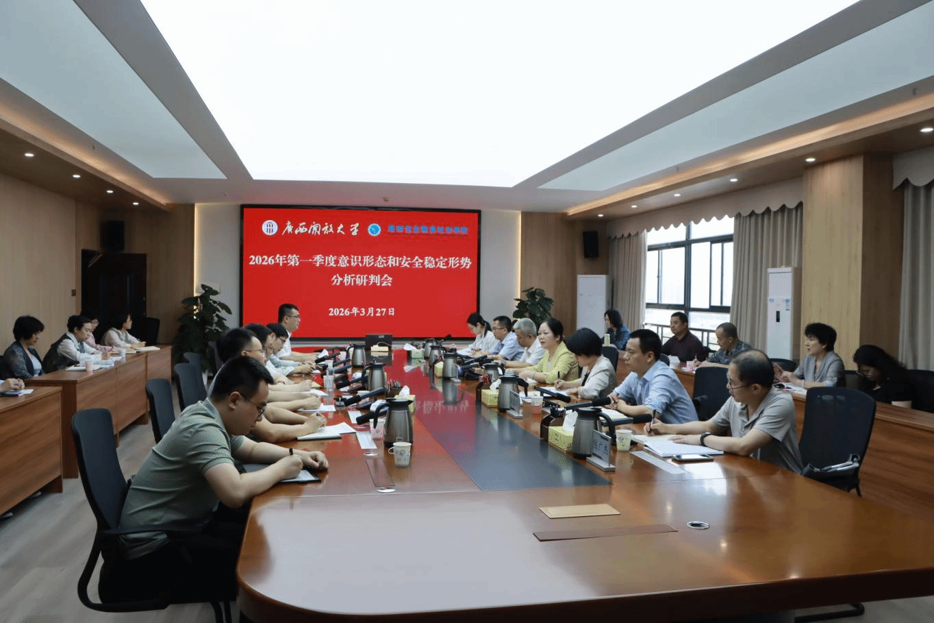 会上,党委宣传部传达上级相关文件精神,通报学校2025年意识形态工作情况,并对2026年第一季度意识形态风险展开研判;学生工作部、后勤保卫处、北斗与通信学院(智能制造学院)分别汇报本领域的意识形态与安全稳定形势及下一步工作举措。