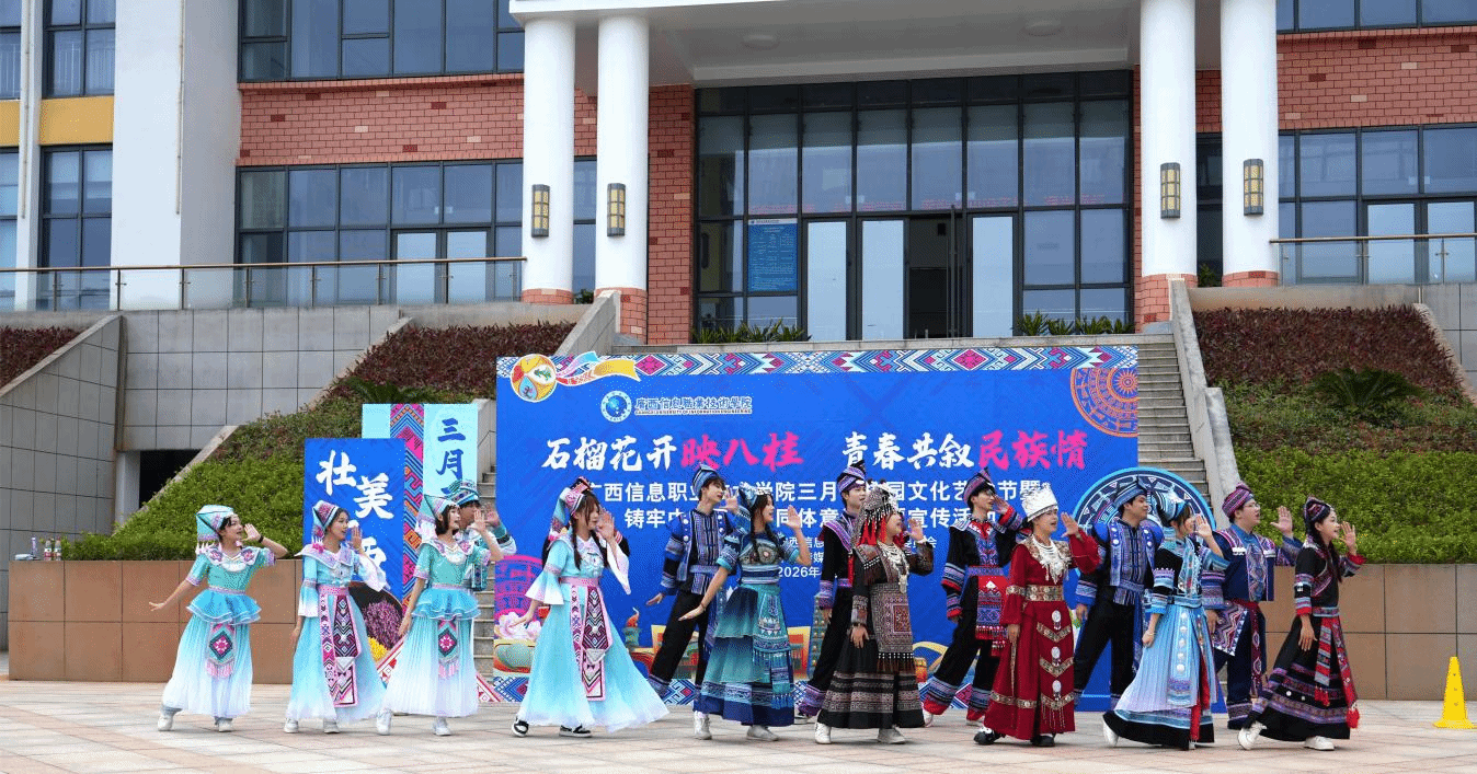 数字艺术与传媒学院 报道 春满壮乡,八桂欢歌,近日,学校开展三月三校园文化艺术节暨铸牢中华民族共同体意识主题宣传活动。师生在文化广场欢聚一堂、载歌载舞,共叙民族团结情谊,现场洋溢着欢乐祥和的气氛。