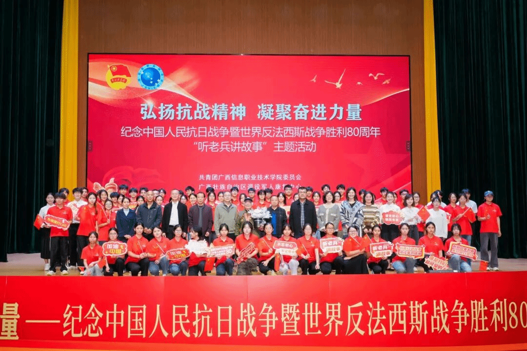 校团委 温舒琳 黄欣怡 黄靖惠 报道 为引导师生从英雄事迹中汲取奋进力量,让爱国情怀在新时代绽放光芒,11月4日下午,广西信息职业技术学院联合自治区退役军人康复中心开展以“弘扬抗战精神 凝聚奋进力量”纪念中国人民抗日战争暨世界反法西斯战争胜利80周年“听老兵讲故事”主题活动。学校全体辅导员、全体青马班学员、入党积极分子、暑期“三下乡”社会实践的志愿者及部分学生干部代表齐聚现场,共同聆听红色故事,感悟使命担当。