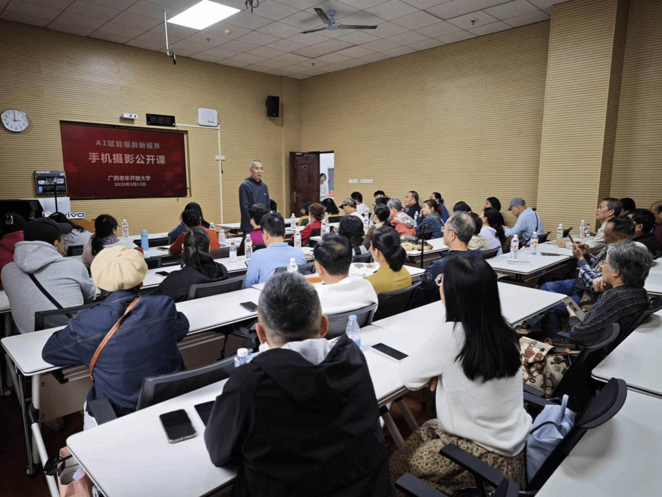 社区教育学院 卓芍 报道 3月13日下午,广西老年开放大学人头攒动、气氛热烈,一场以“AI 赋能银龄新视界”为主题的手机摄影公开体验课在这里精彩上演。活动现场座无虚席,80余名社区居民早早来到教室,有的拿着手机跃跃欲试,有的互相交流着日常拍摄中的小困惑,期待在这场“零门槛”公益课中收获新技能。